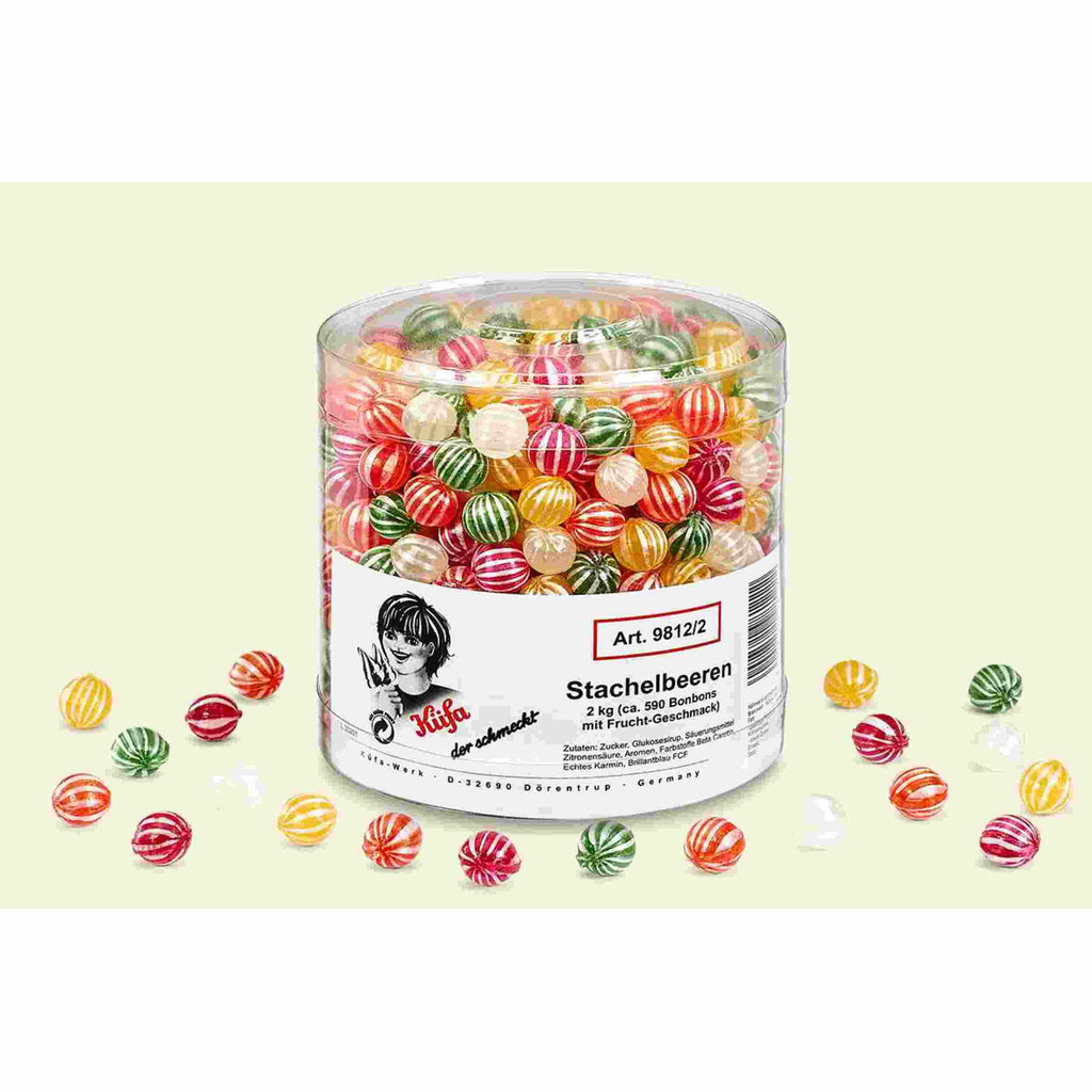 Die silbern glänzenden Streifen geben den Bonbons in Stachelbeeren-Form ein unverwechselbares Ausssehen. Verschiedene Fruchtgeschmacks-Richtungen gemischt (gelb = Zitrone, orange = Orange, grün = Apfel, rot = Himbeere und weiß = Erdbeere). Die Klarsichtdose mit 2 kg Bonbons ist besonders interessant für Großverbraucher und Händler, die den Kunden die Bonbons interessant präsentieren möchten und diese dann nach Wunsch abpacken (z. B. Kioske).