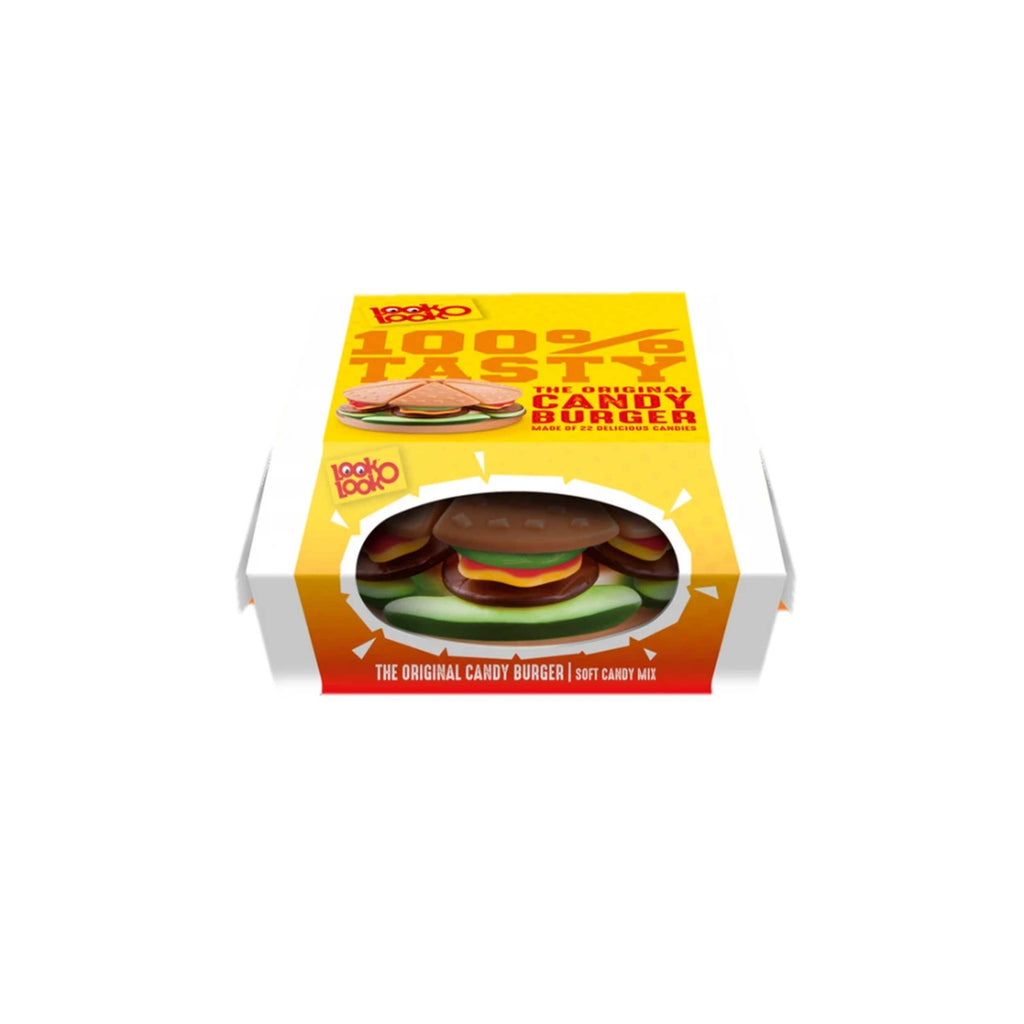 Der Candy Burger ist die süße, fruchtig-bunte und mit 8,5cm Durchmesser fast originalgroße Variante des Fastfood-Klassikers. Die mundgerechten und sorgsam zu einem kleinen, süßen Kunstwerk arrangierten Einzelteile imitieren einen Brötchendeckel mit Sesamkörnen, Burger-Fleisch, Käse, Salat, Ketchup und Gurkenscheiben – alles aus Fruchtgummi und Schaumzucker, verpackt einer original Burger-Schachtel.