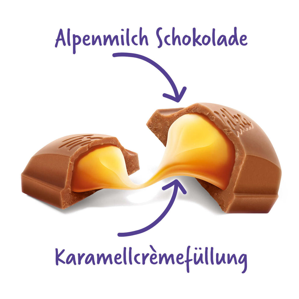 Goldiger Karamelltraum. Milka Caramel ist eine Creme aus Karamell unter einer Hülle aus zarter Alpenmilch-Schokolade. Lassen Sie Ihre Geschmacksknospen vom vollmundigen Aroma des flüssigen Kerns erobern, der ein cremig-süßes Nascherlebnis verspricht. Übrigens: Wenn man die Tafel in einzelne Stückchen bricht, wirken sie durch die gewölbte Form auf einem Teller platziert wie Pralinen - der Naschhit beim Fernseh-Abend auf der Couch oder in geselliger Spielerunde.