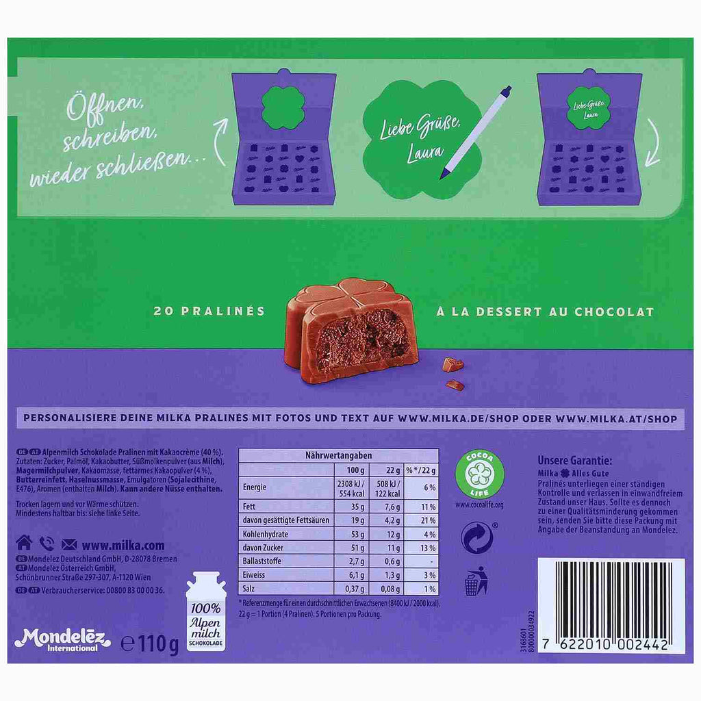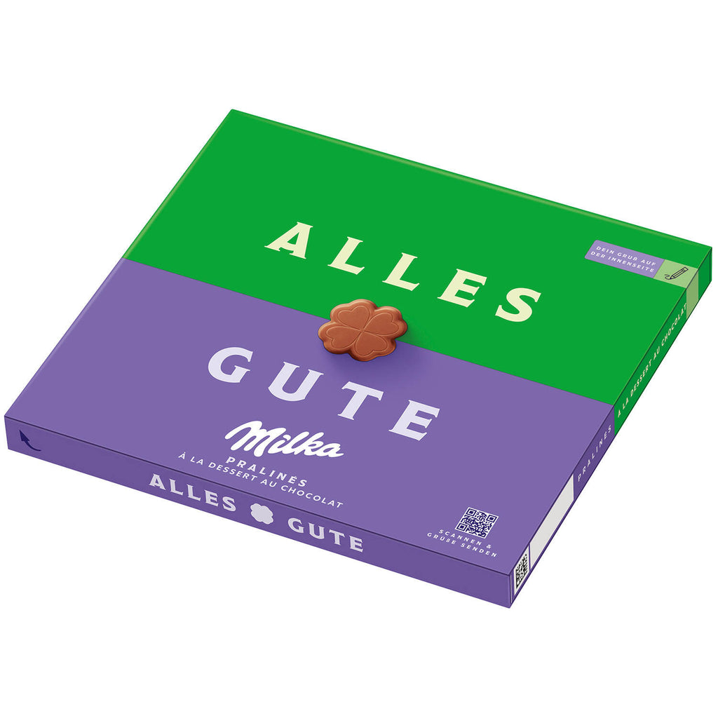 Sagen Sie es mit Milka. Das ganze Jahr über gibt es viele verschiedene Anlässe, zu denen ein passendes Geschenk oder eine kleine Aufmerksamkeit gefunden werden will. Mit Milka "Alles Gute" Pralinés überbringen Sie zu jeder Gelegenheit Ihre besten Wünsche – ob zum Geburtstag, zur Genesung oder als Aufmerksamkeit für zwischendurch.Die kleeblattförmigen Pralinen aus Alpenmilchschokolade sind mit einer zarten Kakaocreme gefüllt und zaubern im Nu ein Lächeln hervor.