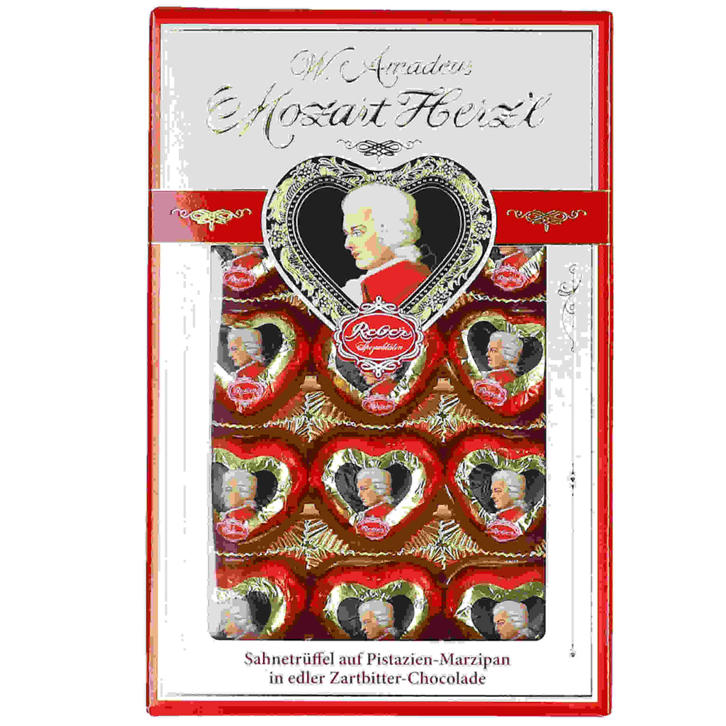 Der Klassiker. Die echten Reber Mozart-Herz’l sind gefüllt mit Pistazien-Marzipan und Sahne-Trüffel. Diese Pralinen-Spezialität ist umhüllt mit edler Zartbitter-Schokolade. Die Herzform der Pralinen verleiht dieser Geschenk-Idee die besondere Botschaft.
