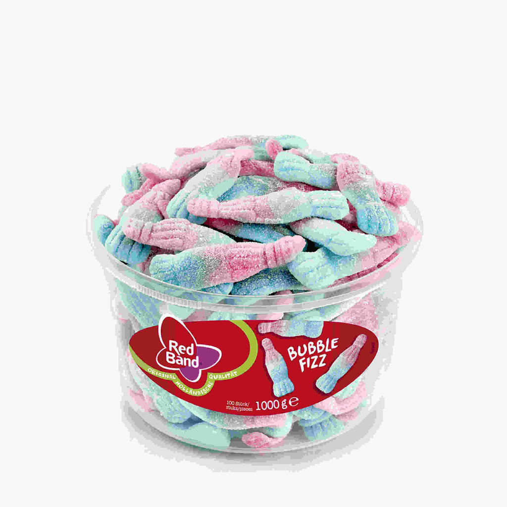 "Kaugummi" aus der "Flasche". Red Band Bubble Fizz mit der markanten Farbgebung lässt Sie zurück in die Kindheit träumen. Diese ca. 7,5 cm große Schaumzucker-Kreation nimmt die ikonische Flaschenform eines beliebten Getränks auf und verhilft dem traditionellen Bubble-Gum zu neuen Ehren. Die leckere Brausepulver-Hülle macht den Naschspaß zu einem sauren Gaumenerlebnis, das lustig auf der Zunge prickelt.