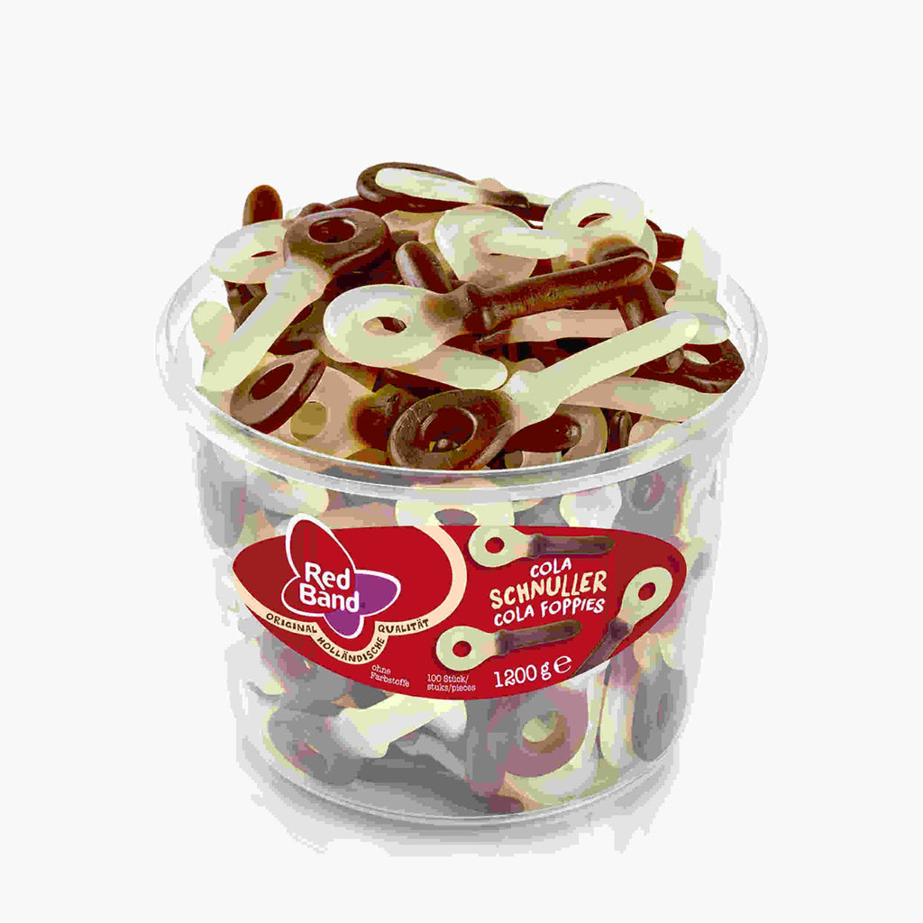 Cola zum Naschen und/oder Abbeißen. Red Band Cola Schnuller sind genau richtig, wenn Sie den bewährten Colageschmack lieben. Die zweifarbigen Schnuller aus leckerem Fruchtgummi schmecken nach der beliebten Kult-Brause und bieten für Groß und Klein ein köstliches Naschvergnügen.