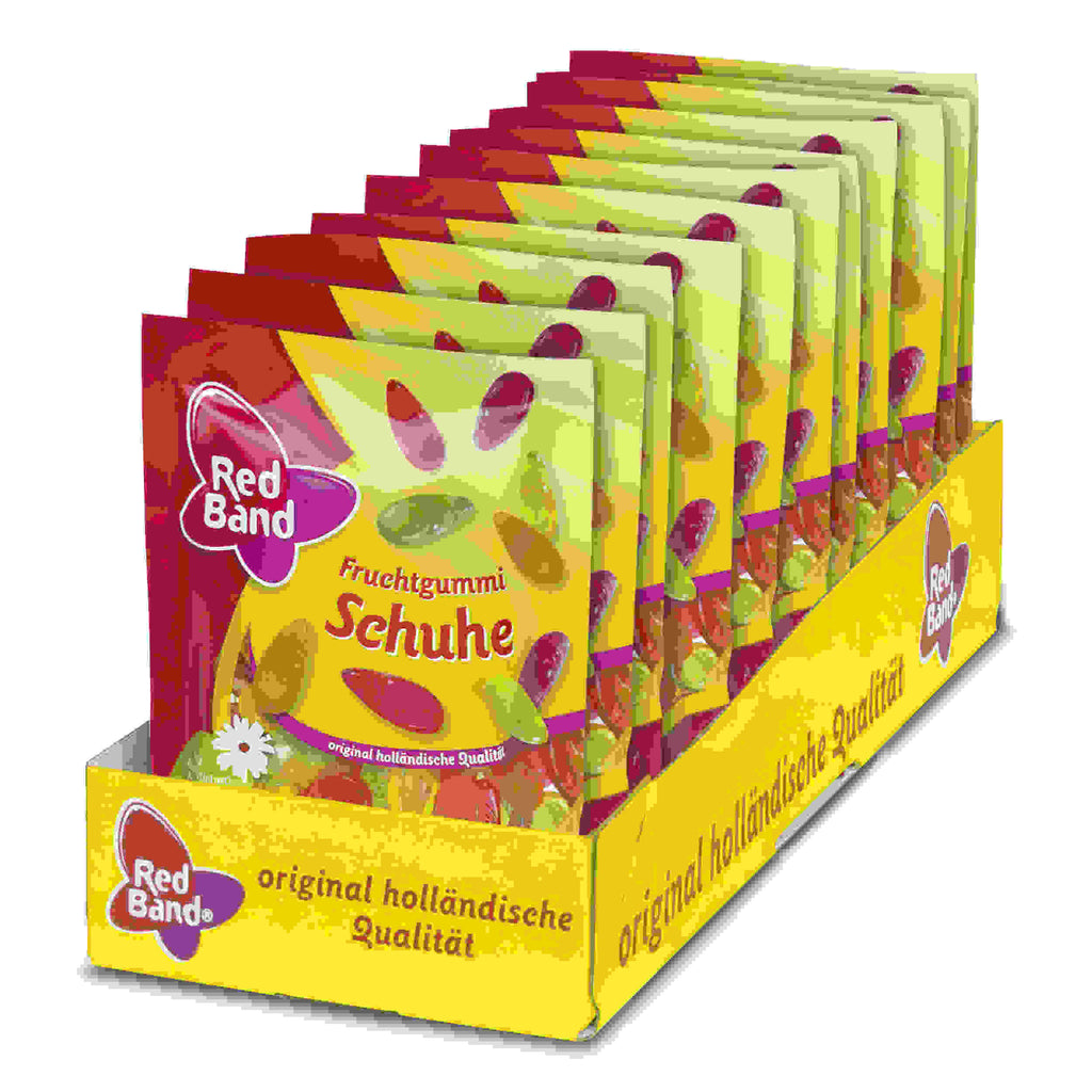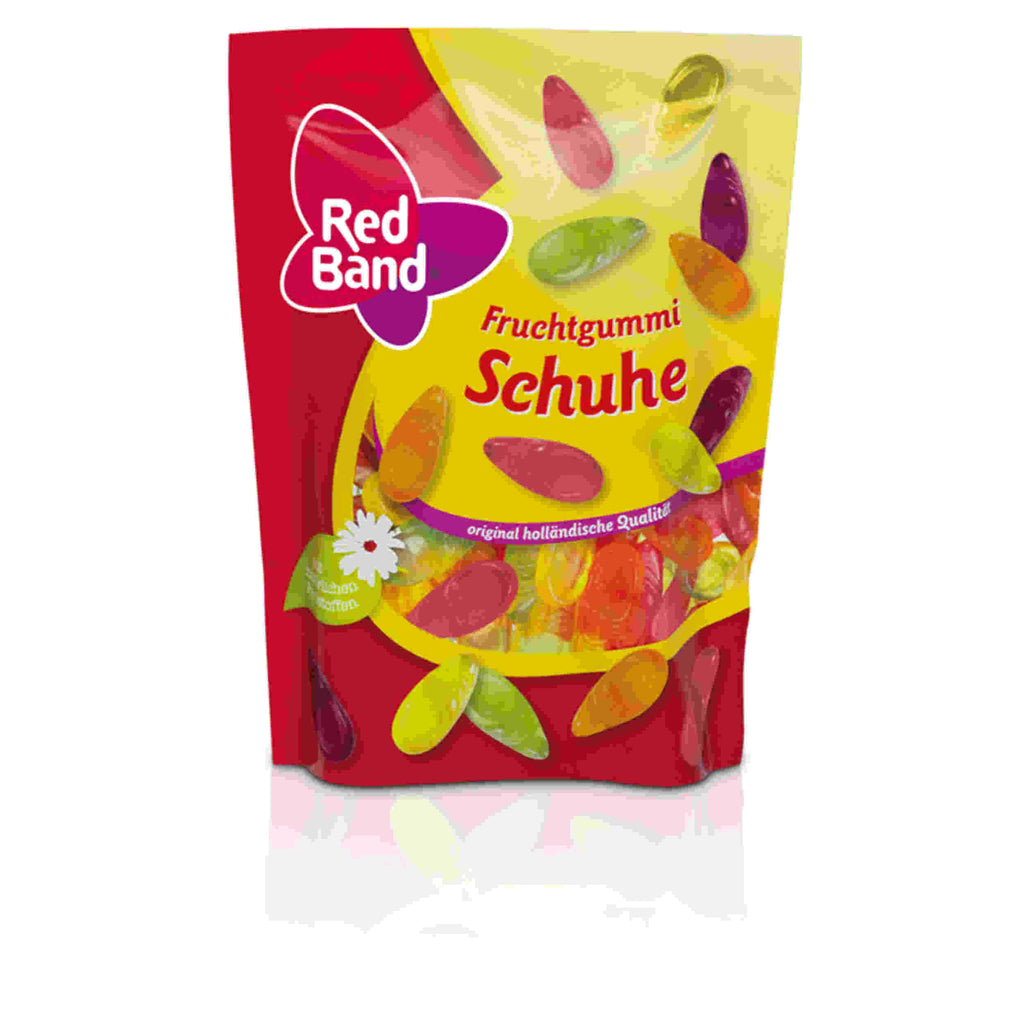 Die bunte Welt der Schuhe. Die Red Band Fruchtgummi Schuhe sind immer in Mode. Die leckeren Schuhe aus Fruchtgummi präsentieren in Orange, Gelb, Rot, Violett und Grün eine abwechslungsreiche Geschmackskollektion für das kleine und große Kauerlebnis. Naschen Sie sie einzeln, paarweise oder nach Lust und Laune bunt gemischt.