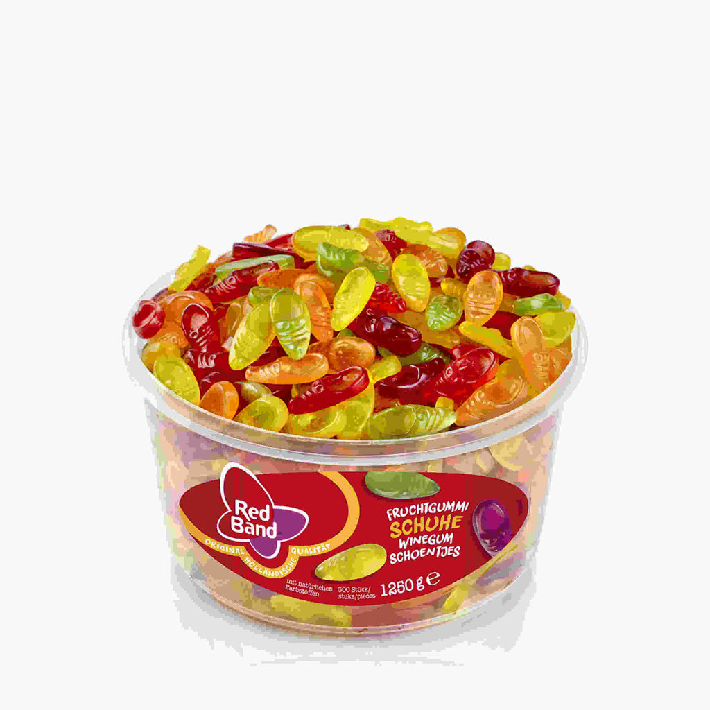 Die bunte Welt der Schuhe. Die Red Band Fruchtgummi Schuhe sind immer in Mode. Die leckeren Schuhe aus Fruchtgummi präsentieren in Orange, Gelb, Rot, Violett und Grün eine abwechslungsreiche Geschmackskollektion für das kleine und große Kauerlebnis. Naschen Sie sie einzeln, paarweise oder nach Lust und Laune bunt gemischt.